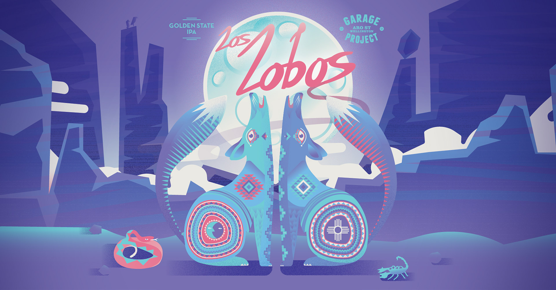 A quick redesign for Garage Project's Los Lobos Golden State IPA. Drawing on the Spanish in the name, two wolves howling at the moon became the main illustration for this enigmatic and quirky illustration job.